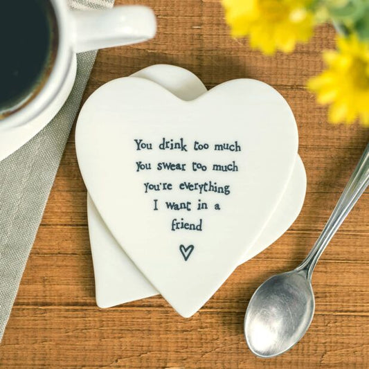 East of India ‘You Drink Too Much’ Porcelain Heart Shaped Coaster