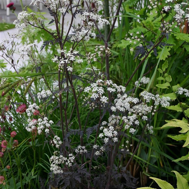 A decorative foliage plant; with mounds of beautiful, lacy foliage in a deep bronze-purple colour. In late spring and early summer, mounds of tiny pink-tinted white flowers are held aloft on tall dark stems giving architectural interest well into autumn, and are well loved by butterflies. Also great for cut flower arrangements and adding form and interest to the border or a large container display.
