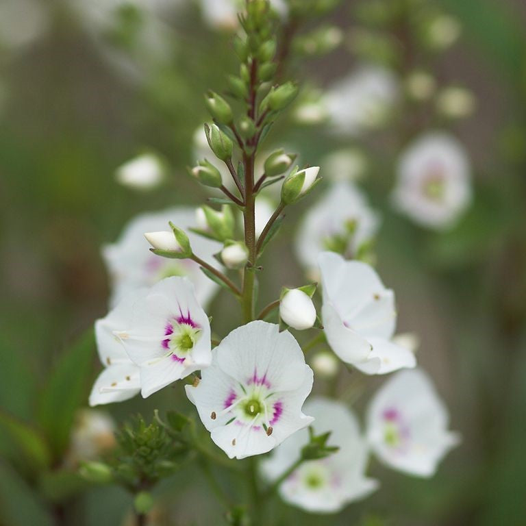 Parahebe 'Avalanche', commonly known as Parahebe, is a compact, semi-evergreen to evergreen shrub forming low, spreading mounds of dark green, coarsely serrated leaves. In summer, it produces short spikes of white saucer-like flowers, each with an irregular purple ring around their eye. This plant is perfect for adding a touch of elegance to garden borders, rock gardens, or as ground cover.