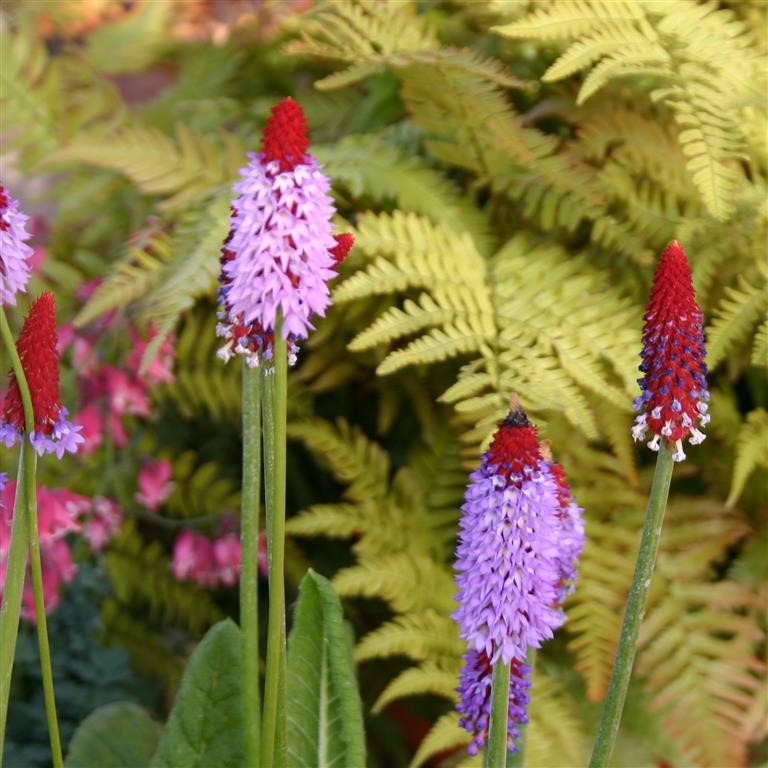 Primula vialii 'Red Hot Poker', commonly known as the Orchid Primrose, is a captivating perennial that produces tall flower spikes with vibrant red buds that open to reveal soft lilac-pink flowers. This unique bloom combination creates a stunning visual effect, making it a standout choice for adding interest and color to garden borders, rock gardens, and woodland settings.