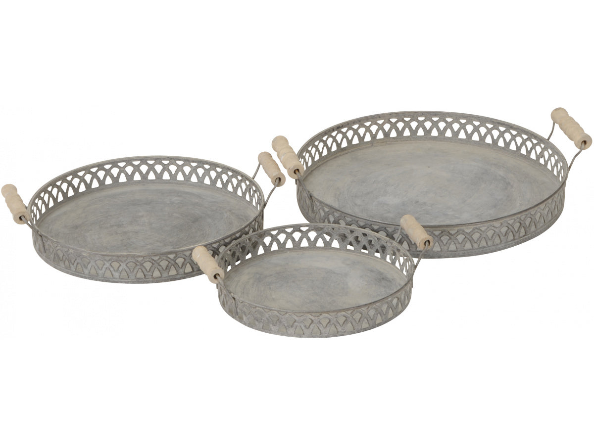 A set of assorted sized round stylish trays. Sure to bring a trendy hint to any home space.