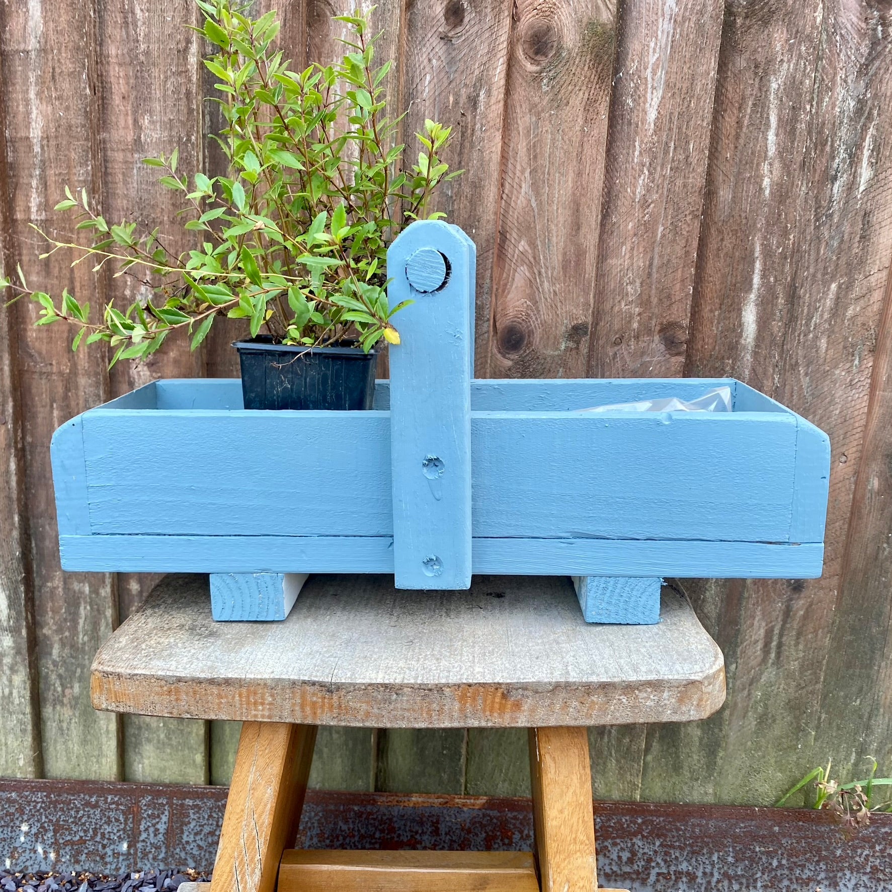 A handmade wooden painted trug. Useful around the garden or for planting up with herbs or seasonal summer blooms.