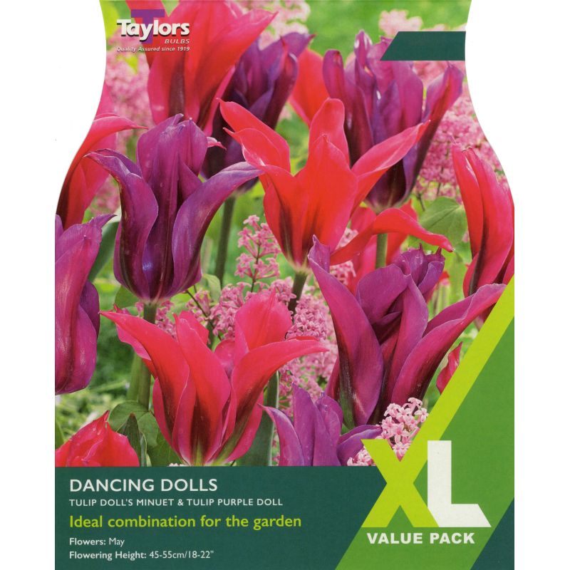 A stunning combination of two elegant tulip varieties – Tulip Dolls' Minuet and Tulip Purple Doll. Together, they create a striking display of vibrant colour and graceful form, making them an ideal choice for borders, beds, or containers.