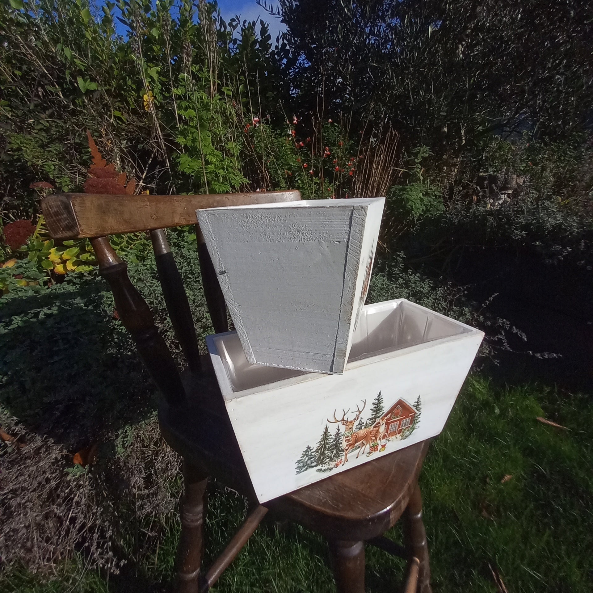 🌲 Design: Rustic wooden trough with festive Christmas scene
